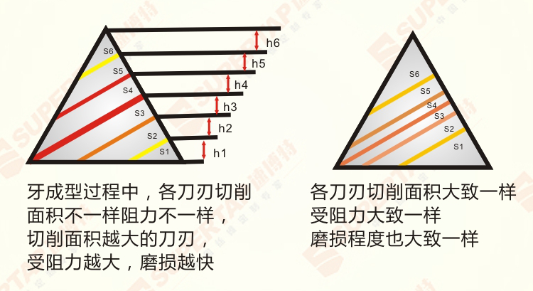 研究發(fā)現(xiàn)絲錐刀刃的磨損和其受阻力大小成正比,而其受的阻力大小與其切削面積成正比。為了解決這個受力不均勻的問題,我們決定研發(fā)一種均衡個刀刃切削量(切削面積)的絲錐,以求讓各個刀刃的阻力和磨損達到一致,防止個別刀刃過早磨損牙。經過多次的實驗測試(在此其間,歷時超過六個月。)我們終于開發(fā)出來各個刀刃切削面積大致相同的絲錐。大大提高了客戶絲錐的使用壽命降低了絲錐的損耗。