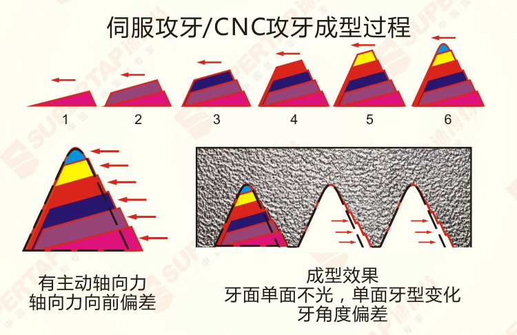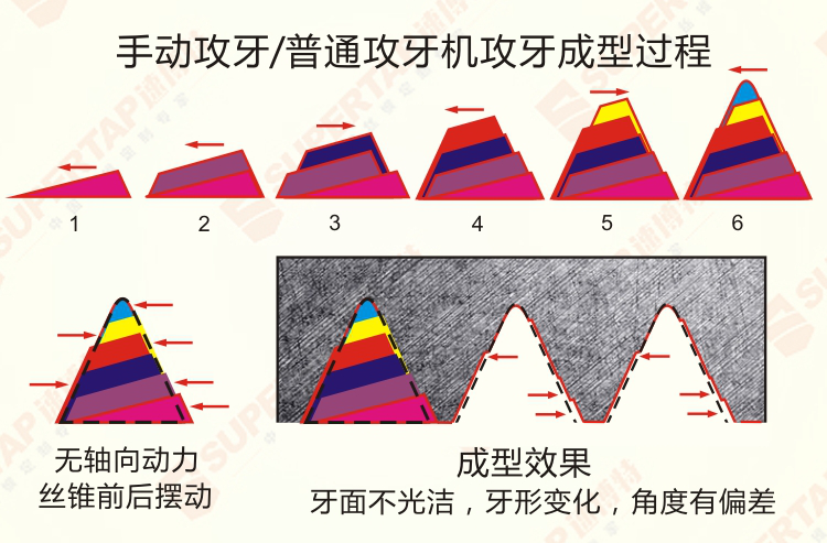 普通絲錐攻牙的時候,如果沒有軸向動力或者軸向動力有偏差的話,會導(dǎo)致牙型變形,牙面光潔度粗糙,以及牙角度偏差等問題