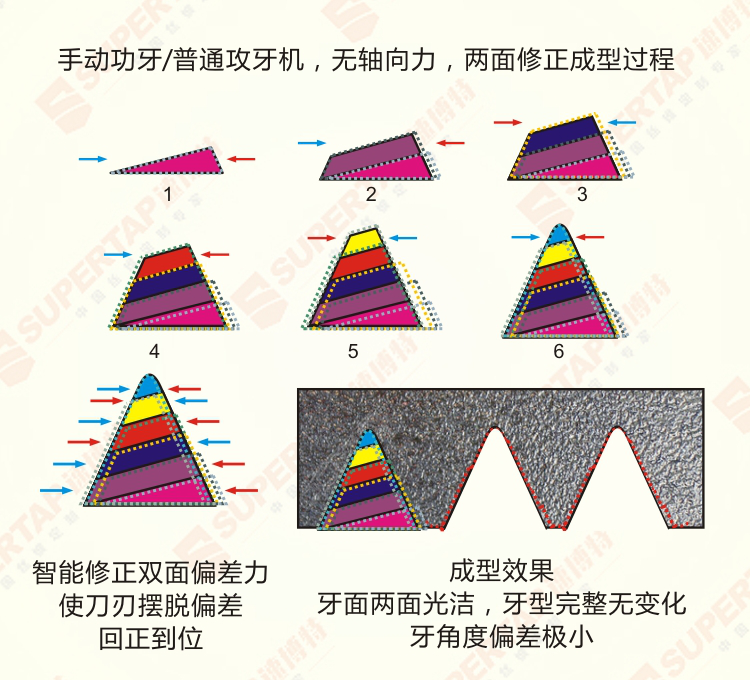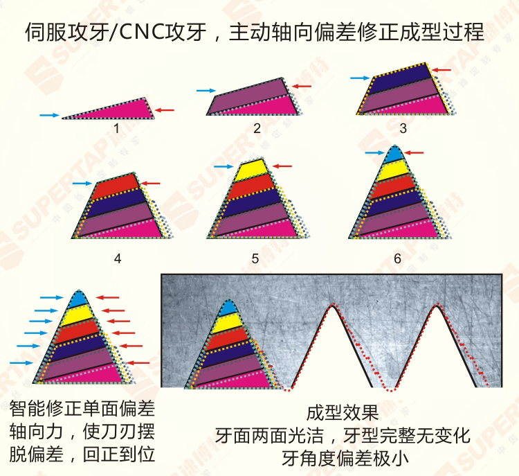 經(jīng)過智能修正技術(shù),絲錐攻出來的螺紋,牙面正反兩面光潔度能達到0.8,壓角度偏差小于0.15度,牙型完整,沒有不規(guī)則變形。